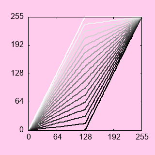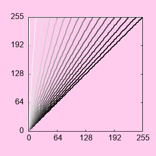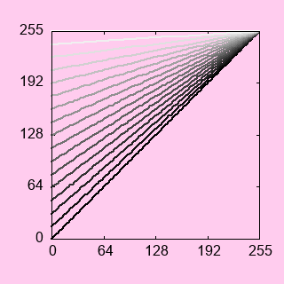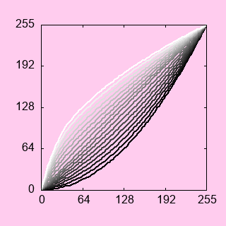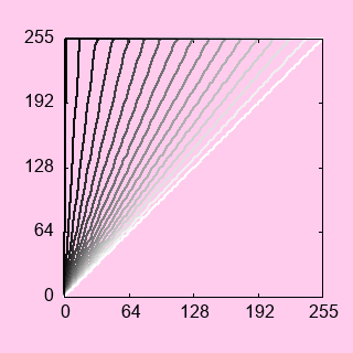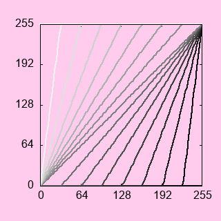 - y=x^γ という式で表されるトーンカーブの γ はガンマ値と呼ばれます。「ソフトライト」は、上のレイヤーによって下のレイヤーのガンマ値をコントロールしているということになります