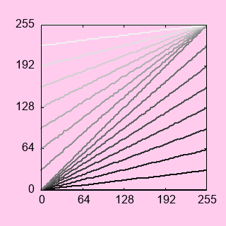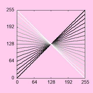 また、これらと合わせて以下のようなグラフも示します。横軸が基本色、グラフの線の色が合成色、縦軸が結果色を表します。レイヤー合成を、「合成色によって基本色のトーンカーブをコントロールしている」と捉えたときのイメージに相当します。