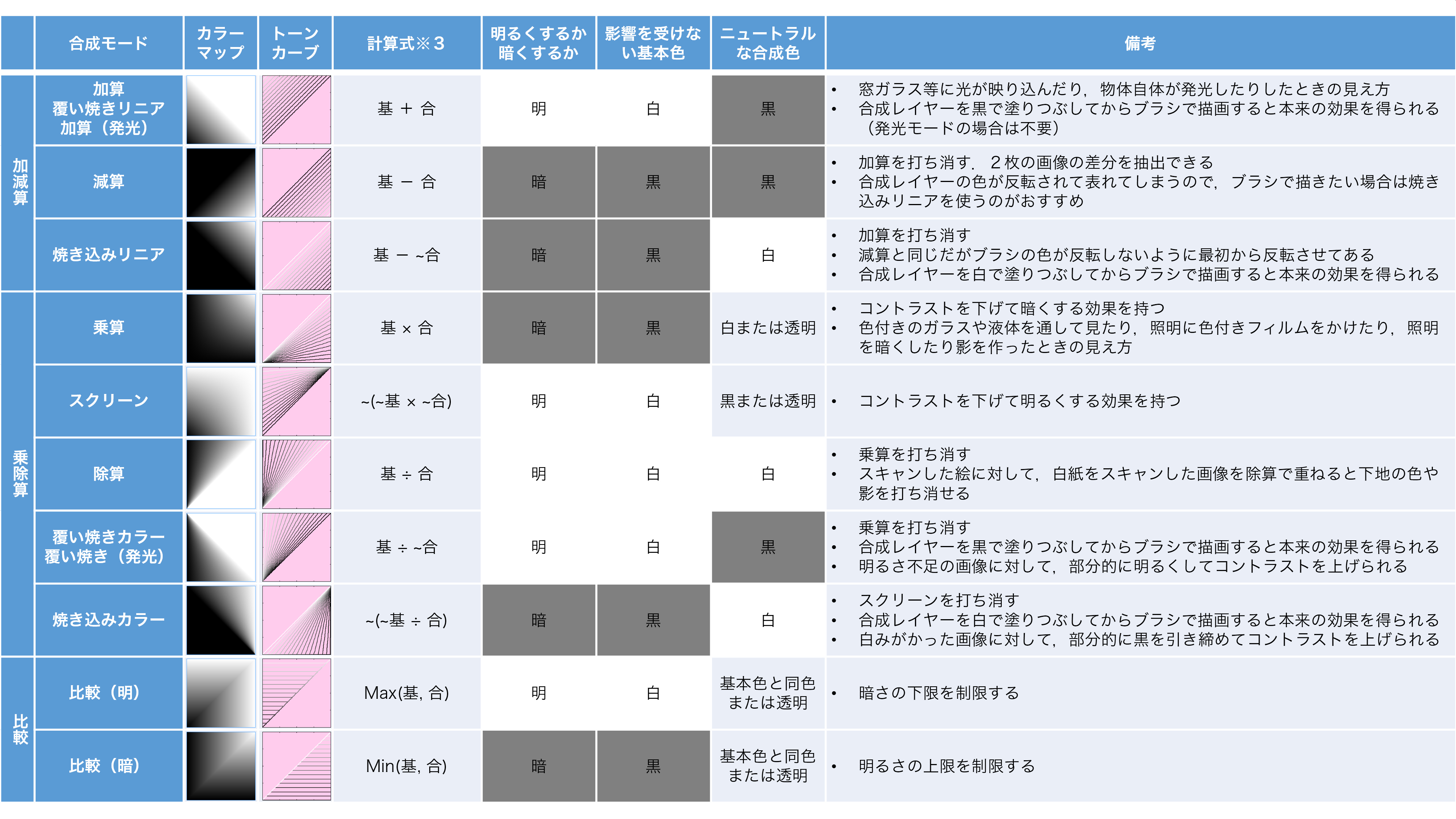 ペイントソフトのレイヤー合成モードについてのまとめです。合成モードの説明はインターネット上にたくさんありますが、使いどころがわからなかったり、細かい動作が不明だったりしたので実際に実験してまとめました。このページでは特に、以下のような点に注目してまとめます。